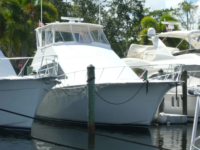 This incredible vessel spent almost its entire life on the Great Lakes in a fresh water, climate controlled boat house. She has none of the usual corrosion or gel coat issues. Truly Palm Beach condition. Standing dockside, this convertible flybridge has all the distinctive lines of a classic offshore fishing machine. This vessel is easily boarded from the wide cockpit gunwales, along with a convenient boarding step box. By water, a transom door with Armstrong ladder gives swimmers quick access to the aft deck. Cockpit highlights include tackle center, beautiful varnished Rocket Launcher, Bait Freezer, Garmin Bottom Display, aft backdown controls, massive fishing deck, and a sliding door into the salon. An aluminum ladder with teak accent steps provides easy access to the flybridge.