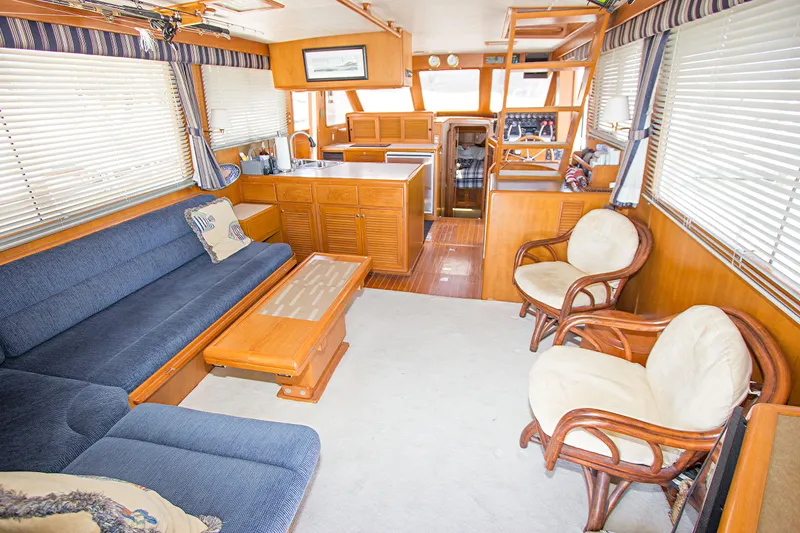 Designed by William Crealock, PowerBoat Guide notes that the Offshore 48 "is a distinctive and well conceived sedan with several features of note to buyers: a priority is placed on outdoor recreation as her generous deck areas suggest)--not only are the walkarounds wide and the cockpit spacious but the flybridge dimensions are extremely generous for a 48-footer. In addition, the wrap-around windows (which by the way are leakproof, thanks to a unique Crealock design) and sliding doors port and starboard make the salon seem expansive as well."