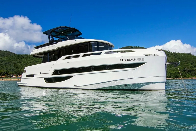 The 2025 OKEAN 52 is designed for those who want space, performance, and comfort on the water. Powered by twin Volvo D8-IPS 600hp engines and an Onan 17 KVA generator, it offers efficient cruising with smooth handling.