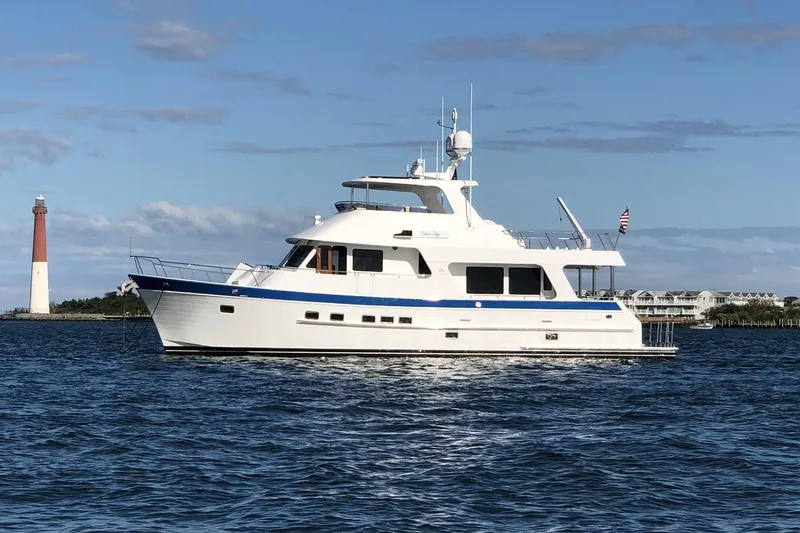 HULL CONSTRUCTIONHand-laid-up FRP hull with PVC core sandwich construction above water lineSolid laminate, commensurate for hull size, made in female moldVinylester barrier lamination for osmosis protectionSimulated planked hullFull-length longitudinal engine stringers and athwartship stringersGel-coated finish above waterlineTwo (2) coats of black antifouling paint over five (5) coats of epoxy primer below waterlineIntegrally molded rub rails with stainless steel cappingFull-length keel extends below running gearStainless steel rudders and struts with two (2) Seatorque enclosed drive shaft systemsCE-approved stainless steel portlightsBoat construction from only 3 major moldsDivinycell PVC cored construction with gelcoatAll deck and hull area hardware attachments are finished with solid lamination – no coringBilge area finished smooth and coated with bright white epoxy paintWindows with 3/8” tempered safety glass in salon and ½’ tempered safety glass in pilothouseVessel Vanguard, Inc. marine maintenance system AFT DECK AREA AND SWIM PLATFORMAft deck with molded teak surfaceFRP built-in extended swim platform4-step dive ladder2” 316 stainless steel removable safety rails on swim platformThree (3) additional sockets added on swim platform for rail storageStairway built-in to port and starboard side from swim platform to aft deck with FRP gate doorsAft deck FRP bench seating with storage beneathTeak tableWet bar cabinetWing doors port and starboardFRP sliding door to salon with glass window top and bottomStainless steel ladder from aft deck to boat deckFRP weather-tight door on transom leads to lazaretteTransom shower in recessed box with hot and cold water supplyFresh water wash down outletShore power inlets for 110v/220v 60hzGlendinning 50 amp cable master with 75’ of cable on transom with additional 50 amp shore power inletLED courtesy lights and LED overhead lightsTwo (2) LED working lights on aft deck overhang to light swim platform316 stainless steel heavy duty cleats secured to stainless steel backing plates inside bulwarksDeck scuppers piped out through transom at boot stripe316 Stainless steel handrail to and from aft deckGlendinning handheld remote control plug-in receptacle SIDE DECKS AND PORTUGUESE BRIDGEMolded with gray non-skid surfaceWeathertight doors opening into pilothouse port and starboardHouse side fixed windows with tinted tempered glassTwo (2) sets of 316 stainless steel spring-line chocks per sideFour (4) 316 stainless steel hawser holes with stainless steel cleats per side recessed in bulwarksFuel fill fittings for tanks recessed into house side316 stainless steel side and overhead safety railsLife ring recessed into the starboard house wallLED courtesy and overhead lightsPortuguese bridge molded with gray non-skid surfaceLocker doors in aft face of Portuguese bridgeHinged door through Portuguese bridge to foredeck½” Clear tempered glass in forward-facing windshieldsThree (3) self-parking windshield wipers with wash down systemWebblon covers for wheelhouse windowsGate doors at port and starboard side upper deck adjacent to the pilothouseGlendinning handheld remote control plug-in receptacle FOREDECKForedeck with gray non-skid surfaceForward-facing bench seat with storage under.316 Stainless steel CE-approved skylight/emergency hatch from the VIP stateroom below316 Stainless steel rail on bulwarks increasing in width going forward316 Stainless steel stanchions to support handrailDeck lockers forward either side of anchor windlass platform finished in white epoxy paint316 Stainless steel dual anchor chute/roller at bow99 lb/45 kg Ultra anchor with swivel and 300’ long 3/8” high test chain110 lb claw-type anchor with 300' of 3/8" high-test chainUpgraded Maxwell HWC-2500c hydraulic horizontal windlass with foot switches and remote controls for dual stations for two anchorsChain stoppersRaw water pump and anchor/chain washing systemFresh water wash down with outletSalt water and fresh water 316 faucets inside foredeck lockersDeck drains plumbed to boot-stripe to prevent black streaksLED courtesy lightsOptional 50 amp shore power receptacle in enclosure on port side of Portuguese bridge FLYBRIDGE AND BOAT DECKExclusive full-beam width deck with gray non-skid surfaceHard top over flybridge with a removable stainless steel ladderCustom aluminum radar mast on hard top with bow and anchor lightsThree (3) solar panels mounted on hard top316 stainless steel safety railsVenturi windscreen with 316 stainless steel railsACR 100D searchlight with dual station controlsMolded FRP steering console with engine controlsElectronics consoleGlendinning engine controls4” magnetic compassTeleflex hydraulic steering system316 Stainless steel destroyer steering wheelTwo (2) Stidd helm seats, Slimline series with powder-coated base and white naugahyde fabricFire system repeater alarmTwo (2) L-shaped settees and one (1) white FRP table to portFive (5) Aquasignal navigation lights in accordance with appropriate collision regulationsKahlenberg D-OA dual trumpet air horn with compressorTwo (2) 24v to 12v DC-DC converters with 12v battery back-up system316 stainless steel hatch and stairs starboard side down to pilothouseLED overhead lights30" BBQ grill and cabinet on port side behind flybridge seating with sink and refrigeratorOne (1) Ocean ISO 8-man life raft mounted into the starboard railing with auto release450KGS/1000lb aluminum painted davit with 4-way hydraulic control, rotating base, luff, lift, pendant switch, and retract/extension arm Glendinning handheld remote control plug-in receptacleStamoid covers for BBQ, windlass, Portuguese, flybridge and aft deck seating, flybridge Stidds and helmABT 13DLX tender with a 60hp Yamaha SALONSliding door entrance from aft deck with Phantom screenFixed windows in house sides with medium 3/8” tinted tempered safety glassTeak valance over windows with LED rope lightingCustom ceiling recess with rope lighting and teak grabrailLED ove
