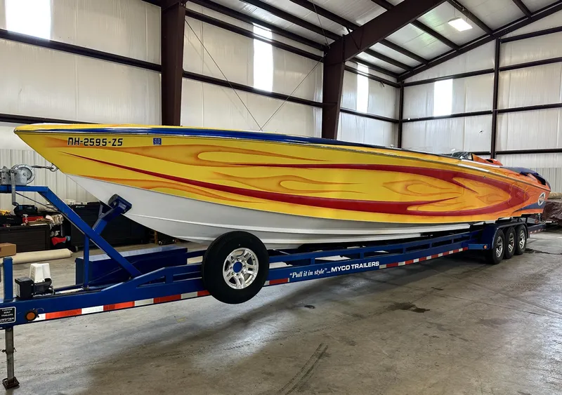 Drivetrain has approx 60hrs since upgrades. The boat has Simrad GPS, Latham Throttles, Livorsi Gauges, Vessel view, Carbon Dash, Dual helm, Sea Deck Flooring, Cockpit Cover, Hering Props, Myco Trailer (new rims and tires) and Custom Outerlimits Paint.