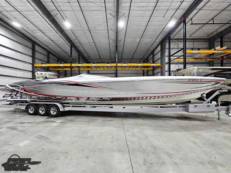 Powered by staggered Mercury Racing 1075 SCi engines with M6 drives, and 5-blade Hering 18x34 16 deg. props with cases. Trim tabs. LED lighting in engine room along with custom paint.
