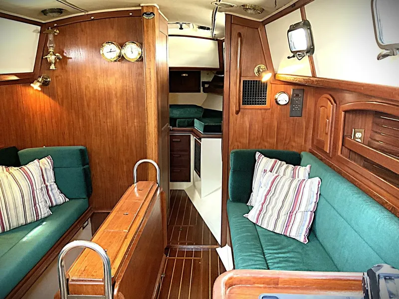 Main Salon - Teak storage lockers & bookshelf w-removable fiddle, both sides. - 6' 6" settee berths, port & starboard with storage bins. - Port settee can be easily converted into 48" wide double berth. - Teak double drop leaf table with center storage and s.s. hand rails. - Two teak loop overhead handrails in headliner, port & starboard. - Teak navigators desk with storage under lift top. - 7' 7" long and 34" wide quarter berth to starboard. Hinged cushion. -