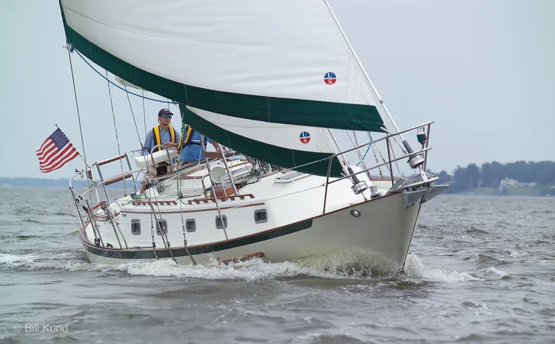 In essence Bill Crealock built the 37 for himself. In his words: "I did not have to pay homage to interiors festooned with bunks, or revered classic features, or long waterlines or short or distorted ends. The 37 is an attempt to provide the cruiser with a boat which will travel fast between ports under complete control, and which will yet remind him that the passage itself should be one of the pleasures of the cruise."