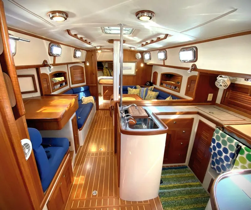 Interior - Varnished teak woodwork. White Formica cabin house trunk sides. - Louvered locker doors & solid drop doors with hidden hinges. - Louvered cabin doors (top half only) & panel head door with piano hinges. - Chrome bronze push button locks on all locker doors and drawers. - 6' 5" headroom with teak & holly sole throughout cabin area. - Positive push button latches on all locker doors. - Wrapped 4" foam cushions with choice of fabrics. - Zippered vinyl headliner with superior insulation, deadens sound & provides easy access to deck hardware & wiring. Forecabin - 6' 7" long and 57" wide double island berth with drawers & shelves. - Teak ceilings above shelves. Teak bi-fold privacy door. - Vanity sink, mirror & large cedar-lined, louvered hanging locker. Main Salon - 6' 6" long "U" shaped dinette to starboard converts to 50" wide dbl. berth. - Sides have teak lockers & bookshelves with removable fiddles above seats, storage bins below. - Teak drop leaf table with with gas spring pedestal. - 6' 3" long settee berth to port with storage below. - Teak navigators desk w- storage under lift top. Nav panel & book shelves. - Enclosed head with bi-fold solid panel door, nonskid flooring, ceramic head with macerator to holding tank, teak changing seat, wet locker, separate shower stall, and numerous dry storage lockers.