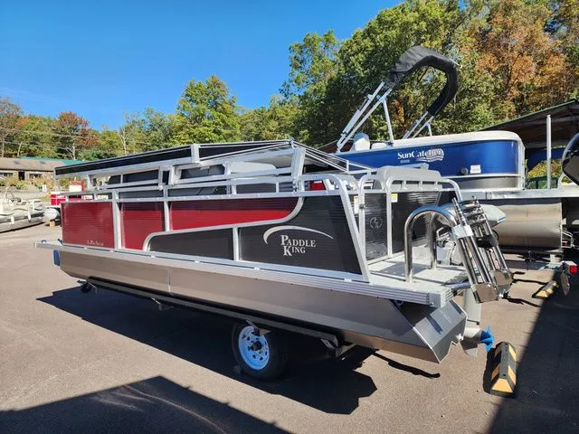 2026 PADDLE KING Lo Pro SOLAR - Cruise and Charge at the Same Time!, Shown with top down for easy storage! Harness the power of the sun with the all-new 2026 Lo Pro Solar pontoon! The dual 410-watt solar panels make up the canopy top. Seats up to 6, and it is fully equipped with all the components you need for a complete system: a 6-horsepower E-Propulsion electric motor, a 48-volt lithium iron phosphate battery, and a battery monitor. We made this system a breeze to own-everything is fully assembled. It is versatile, durable, and affordable. The Solar's roomy deck and new sun lounge seat make it great for fishing or a quiet sunset cruise. Other features include two swivel seats and table, cushioned arm rest, sun lounge seat with integrated cushions, corner rod/drink holders, mooring cover with 4 poles and individual seat covers too! Photos for illustrative purposes only. Add a trailer for only $3,695 or use our affordable delivery service!