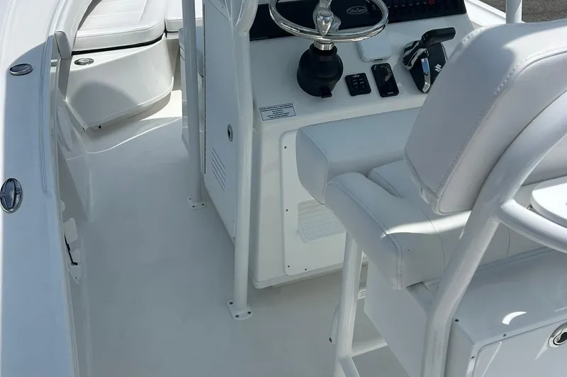 White Gelcoat color, interior liner with non-skid, deck cap with 27 gallon livewell, full composite 3 Piece construction, standard console with insert, footrest, and glove box, full transom bracket for 25″ motor, 80 gallon fuel tank/epoxy coal tar epoxy, white rub rail with stainless insert, polished aluminum leaning post with flip up bolster and backrest, full power steering, 12×12 Electropolish Lenco trim tabs with LED indicator switch, 4 Gemlux SS screwless rod holders, 6 Gemlux SS pull up cleats, battery switch-on/off/both, custom Contura 5 dash panel with breakers, 12V plug, and dual USB plug, 1500gph bilge pump, 800gph livewell pump, bronze seacock with strainer, water/fuel separator, aft in floor fish boxes-drain to stern, forward fish box, anchor locker with anchor mount, under gunwale rod storage racks, raw water washdown, 3/8″ acrylic window, Accon SS Pop up bowlight, anchor/all around light, 4 LED under gunwale lights, SS Swim ladder with grab rail, 1/2″ SS bow and stern eyes, Suzuki 200 DF200APXW5