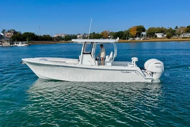 Twin 300 Yamaha (White), DTS controls, power steering, white gelcoat hull color, white gelcoat interior w/non skid, new Euro transom design, forward fish box and rear dual fishbox in floor, full transom deck with 40 gallon livewell, large split door console, full composite construction, 226 gallon fuel tank epoxy coated new EPA standards, white rub rail with stainless insert, custom upholstery, in-floor fishbox drains to stern, rod storage underneath gunnels, polished aluminum leaning post with flip up bolster and backrest, Seakeeper 525 Ride System, 4 Gemlux SS screwless rod holders, 6 Gemlux SS pull up cleats, battery switch-on/off/both, custom Contura 5 dash panel with breakers, 12V plug, and dual USB plug, 1500gph bilge pump, 800gph livewell pump, bronze seacock with strainer, water/fuel separator, aft in floor fish boxes-drain to stern, forward fish box, anchor locker with anchor mount, under gunwale rod storage racks, raw water washdown, 3/8" Acrylic window, Accon SS pop up bowlight, Accon pop up bow chocks, anchor/all around light, 4 LED under gunwale lights, SS Swim ladder, 1/2" SS bow and stern eyes