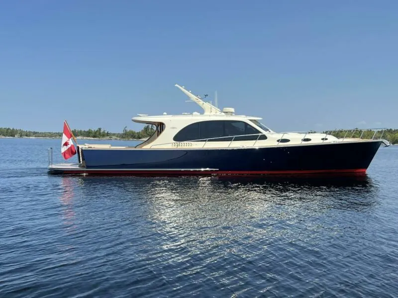 Latest generation E-class, Vinylester, epoxy resins and stitched multi-axial fabric over Corecell linear foam are used to provide a very strong, but lightweight hull and deck. All bulkheads and fixed furniture are structurally bonded to the hull and deck for superior strength and rigidity like a performance racing yacht. Each model is engineered with proprietary noise silencing materials and exclusive Quiet Chine hull to provide a tranquil environment while aboard.