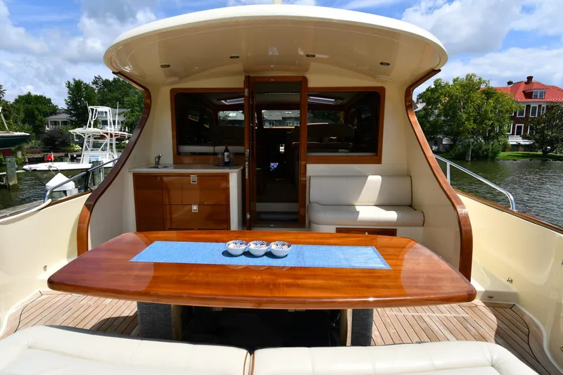 - Ergonomically designed helm station with chart table, electronic instrument panel, teak steering wheel and custom helm seating