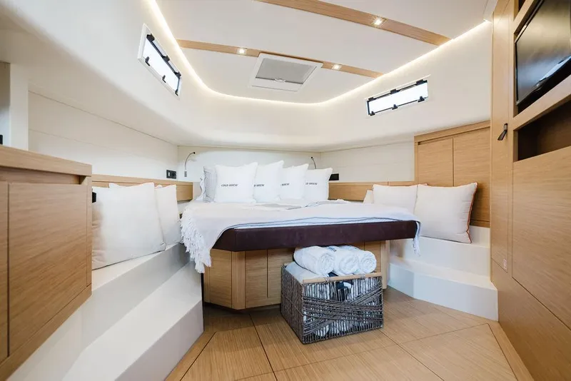 COLD BREW is a striking blend of luxury and performance, featuring sleek, contemporary Italian design. Launched in 2022 by Pardo Yachts, she is powered by twin Volvo IPS 650 engines, delivering maneuverability and impressive speeds up to 38 knots, ensuring a smooth and exhilarating ride. The spacious interior includes a well-appointed cabin with modern amenities, a fully equipped galley, and is spec'd to the highest standards. She features many upgrades including a custom Pagani paint scheme with orange cushions, upgraded stabilizer, FLIR camera, electric bimini, and aft shower on the swim platform. Ideal for both day trips and extended voyages, the Pardo 43' COLD BREW is the perfect balance between elegance and functionality.