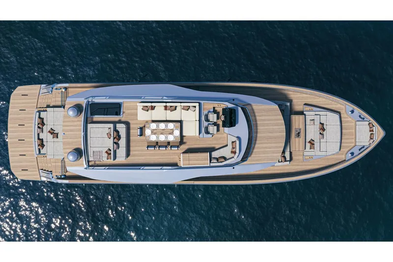 More space, more volume and comfort on board are some of the promises of Endurance 72, immediately evident in the cockpit area. Here, thanks to the fold-down side terraces and the aft platform, we can obtain a huge chill-out area of over 40 square meters, directly overlooking the water. In addition, at the stern we find a garage with hydraulic opening capable of accommodating a tender up to 4m in length.