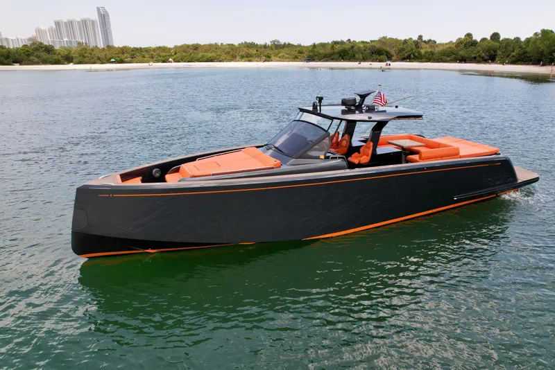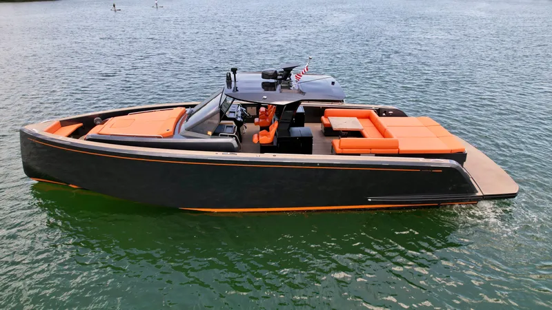 - Custom Hermes inspired orange upholstery with diamond stitching and matching graphics on the hull. The hull is painted in Grigio gray.