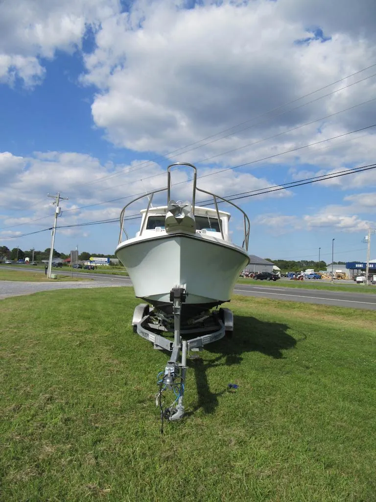 Pilothouse: Tinted windshields (stbd opening) & windows (sliding side windows w/screens); headliner; cabin light; pedestal seat w/cushions & footrest; inboard facing lounge seat (port) w/tackle cabinet (3 tray), interior storage & grabrails (fore&aft), storage tray (stbd)