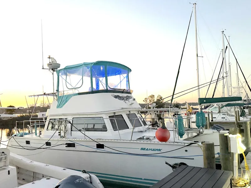 This beautiful Power Cat Trawler shows like a new boat. She is absolutely immaculate and has been kept up to date by her very attentive owners. Cruise or live-aboard, this is a boat that actually solves the space problems you've noticed on other boats. The Passage Maker is a "CAT", so you won't find odd shaped nooks and crannies like other boats but what you will find are two cabins large enough to hold queen size beds, loads of storage space, extensive interior light and lots of ventilation throughout. The salon/dinette area (solid wood cabinets throughout) seats six or more comfortably and the lower helm is positioned nicely for the Captain to join in on any socializing. The flybridge is quite large and accessible via stairs from the cockpit. The deck area has grab rails everywhere and the walkways are wide enough for two people to pass one another easily. And docking is a breeze with a sharp turning radius! This is an extremely well kept Passage Maker and is rarely seen on the market with these incredible features.