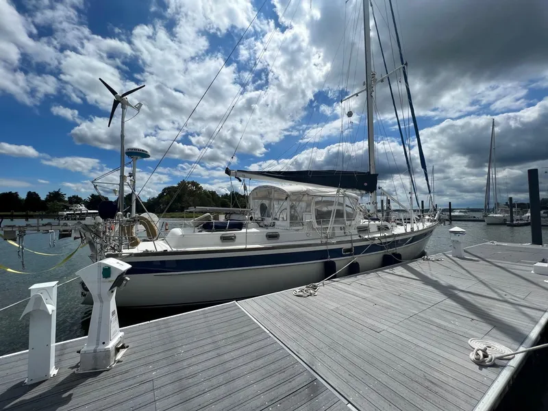 Designed by William Shaw the classic Pearson 530 is an excellent platform for distance cruising. The center cockpit design offers great protection when offshore with wide side decks for moving about the boat with ease, an excellent configuration for short handed sailing. Below decks provides a spacious salon with the nav station to port an and elegant settee to starboard. Forward features a mid cabin / utility room with washer and dryer leading up to the forward head large V-Berth with a large overhead hatch for dousing sails. Moving aft through the cabin the galley is found to starboard with deep refrigeration, propane stove & oven, microwave and double stainless steel sink, accented with LED lighting. The aft stateroom on the Pearson 530 is expansive with plenty of storage for extended cruising, queen island bed centerline, and private head complete with separate shower. A very comfortable layout while underway or resting at anchor.