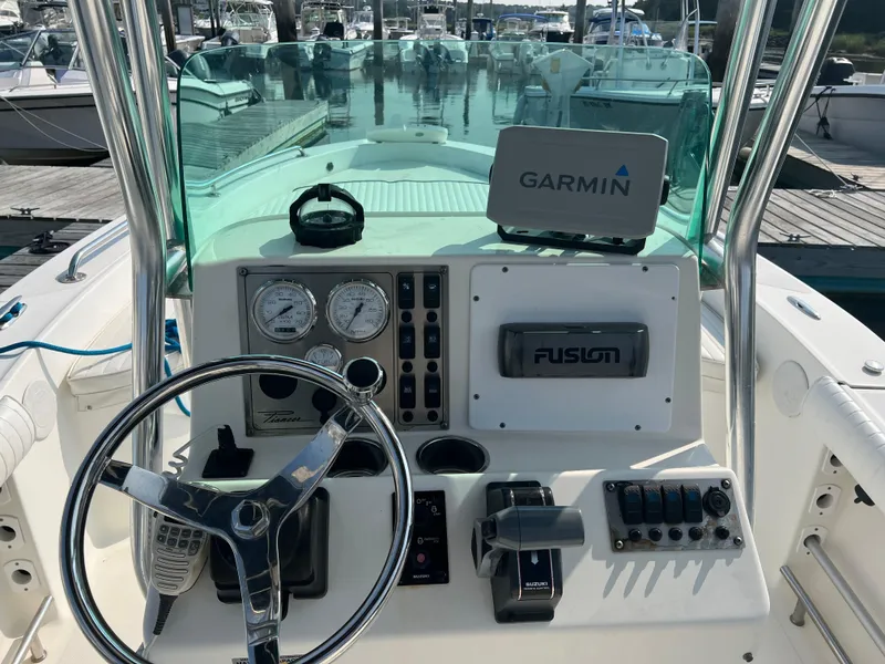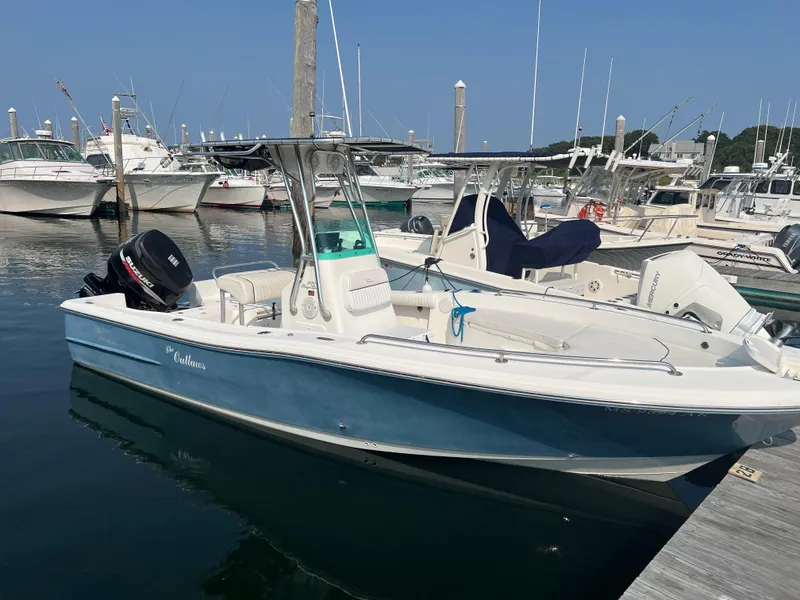 The 220 Bay Sport combines the versatility of a bay boat's shallow to medium draft and spacious fishing platform with the comforts and ride of a Sport Fish. Powered by a Suzuki 225 Fourstroke engine with just a total of 486 hours. This boat has always been professionally maintained. Optional Equipment and accessories include: *Low Profile Bow Rail, *Bow cushion, *Forward Console Cooler, *Fold Down Aft Seating converts to a Casting Deck, *Rod Storage & Rod Holders, *Livewells *Tilt Helm, *Fusion Stereo w/ waterproof speakers, *GARMIN 7" GPS/Sounder, *Ship-to-Shore VHF Radio, *Ample Storage