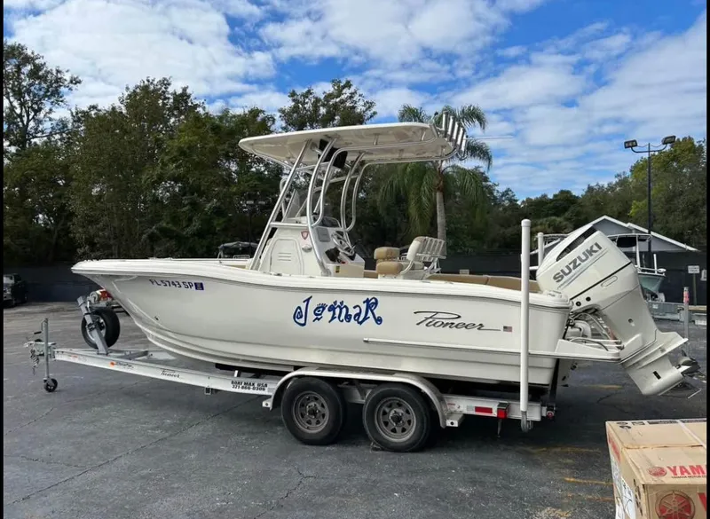 Want a fishing machine? This 2020 Pioneer 222 Sportfish is equipped with a Suzuki DF250TXW with digital upgrade and includes a 2020 custom Amera Trail tandem axle trailer. Don't forget the deluxe hard top with radio box and spreader lights, JL Audio Stereo, fresh and raw water wash down pump kits, 12/24 volt trolling motor plug, pop up bumper holders, bow cushion set, forward facing back rests, footrest, porta potty, tackle center and Engel 80 Cooler.