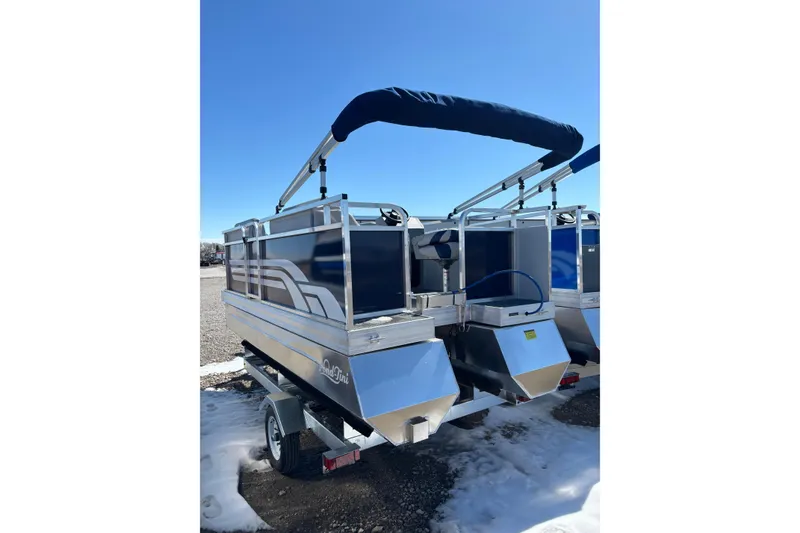 12 Series, with LARGER 14 Series Pontoons, and motor recessed in the deck. Includes Bimini, Cover, Merc 7.5E, lithium battery, throttle control and digital motor information screen and trailer.