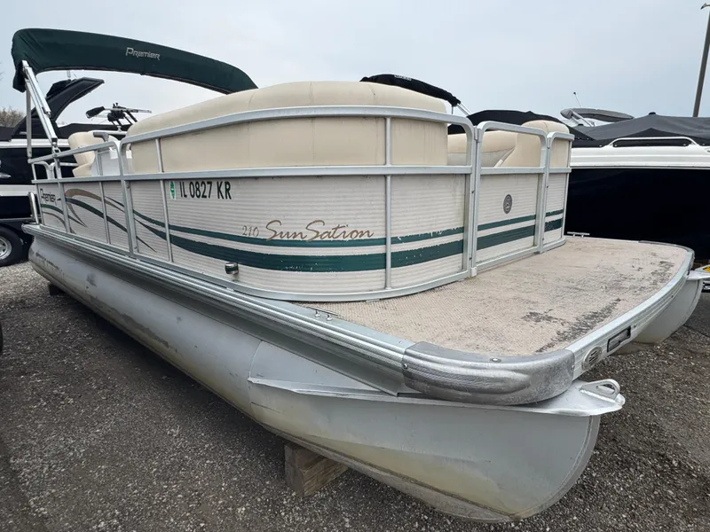The 2007 Premier 210 Sunsation pontoon boat has a length of 21 feet, a beam of 8'6", and a dry weight of 1700 lbs. It has a fuel capacity of 30 gallons. The max engine horsepower is 100 hp. The Sunsation series, including the 210, is known for its build quality and stability.