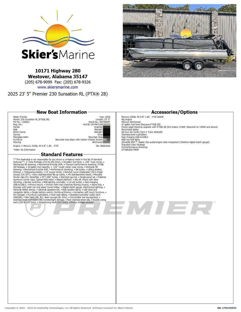 2025 Premier 230 Sunsation RL (PTX 28), The 2025 Premier 230 Sunsation is your ultimate choice due to its blend of luxury, performance, and versatility. Its innovative PTX™ 28 chassis offers a smooth, stable, and high-performance ride that banks in turns like a sport boat. The boat features plush, customizable, all-rotocast (no wood) furniture with abundant storage, a "Captain First" elevated helm, and premium tech like available JL Audio systems and wireless chargers. With multiple floor plans, including dedicated angler options, and durable co