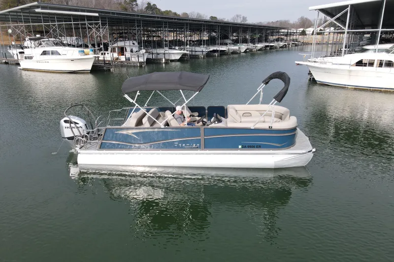This 2021 Premier 230 Sunsation PTX delivers true performance tri-toon handling paired with strong Honda 250 power, premium seating, and a clean, well-cared-for presentation. With Premier's PTX performance package, this boat planes quickly, runs flatter at speed, and handles chop and turns with noticeably more stability than traditional dual-toon pontoons.