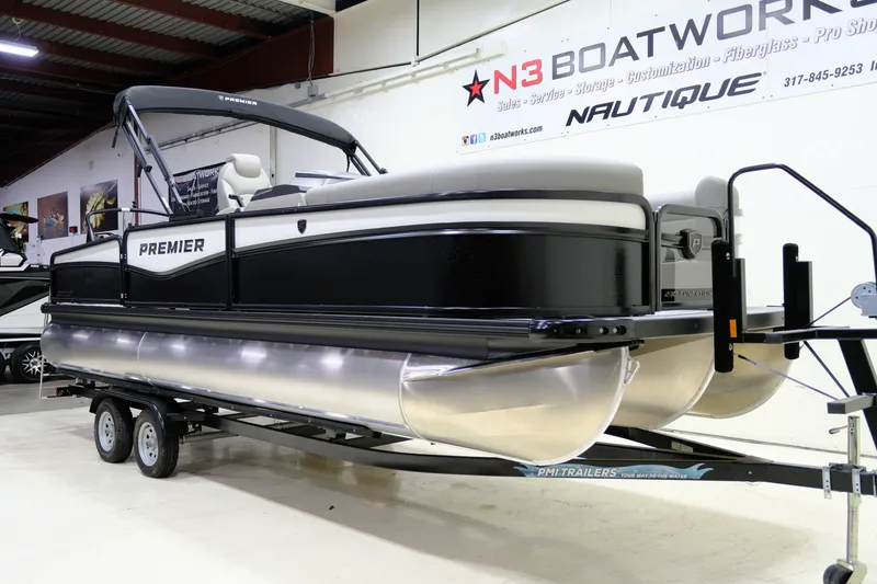 2026 Premier 230 Sunsation RS, Panel(s) Color: Two tone panel Eclipse Package: ECLIPSE PACKAGE: Blackout styling Ladder: Telescoping 4" wide step ladder Fiberglass Helm Color: Mountain Gray Furniture Base Color: Mountain Gray Furniture Accent Color: Carbon Weave Flooring Color: Birchwood Lounge Back Upgrades: Lounge back tip-out trash (Port bow) Interior Accessories: Couch Toe Kick Lights Interior Accessories: Stainless Steel Cupholders Charging Stations: Fast charging USB-A/USB-C in all couches Navigation Gauges & Displays: Lowrance Eagle 5" display Sound System: Wet Sounds MC-2 stereo, RECON 6.5" speakers with RGB (6), 10\" ZERO subwoofer, digital amp Rear Social Table: Standard removable pedestal table mount Boat Battery System: Single battery system Onboarding Battery Charging Station: Onboard battery recharge system Biminis & Towers: 10' Power Arm Chassis Type: PTX28 package Engine Pre Rigging: Yamaha Mechanical w/ Integrated Steering Engine Model: Yamaha F200XD Steering: Hydr. Power Assist Fuel Tank Size: 33 gallon Extended Perf: Full Performance Sheeting Ski Tow Bars: Ski tow bar lighted