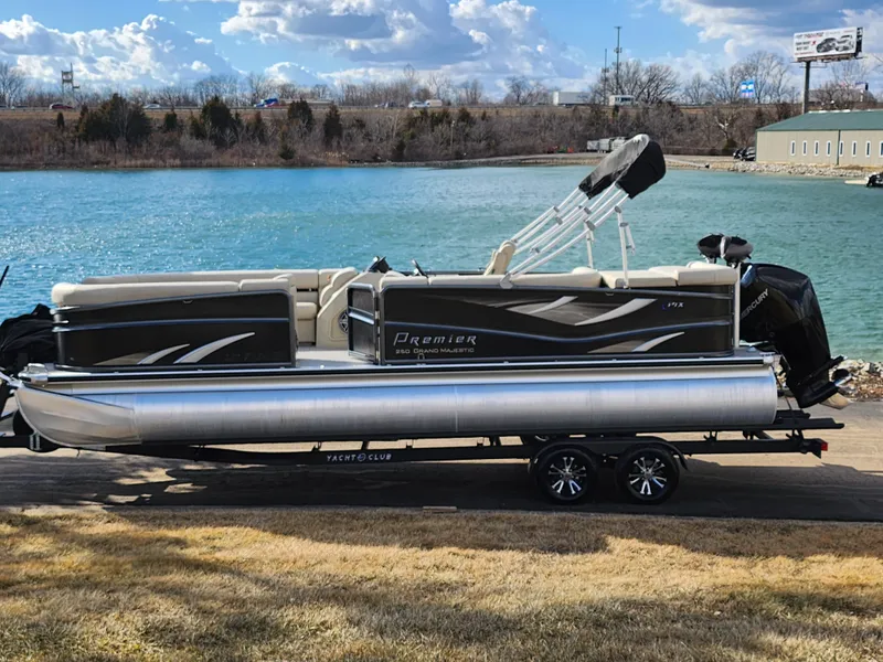 2019 Premier 250 Grand Majestic TriToon comes with: 250L Mercury with 209 Hours, Swim Deck w/ Ladder, Custom Cover, Bimini Top, In-Floor Storage, Sun Deck, Dometic Fridge, Sink, Changing Station, Stereo/BT, and more. Trailer Included