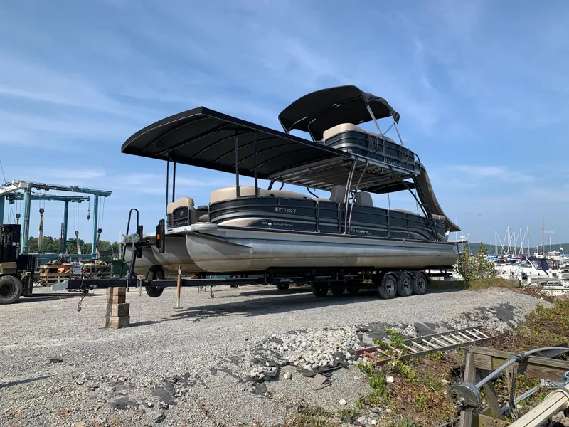 New listing. Single owner, all freshwater Lake Champlain use. In water from June through September only. Includes triple axle galvanized bunk pontoon trailer!