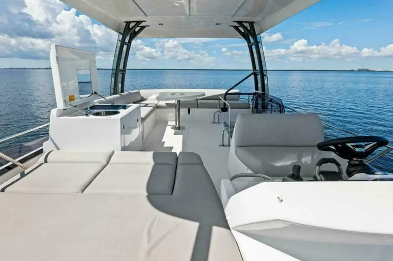 - The flybridge is a standout feature of this model, providing a spacious area for relaxation and entertaining. It typically includes a helm station, a sunbathing area, and often a wet bar with seating for guests.