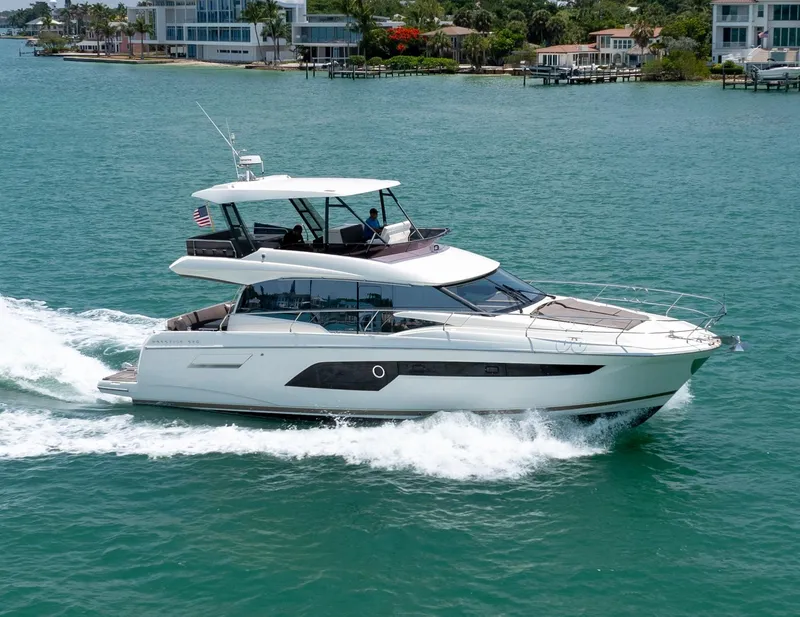 This 2019 Prestige 520 Fly has been maintained and serviced routinely by the same service center since new. "Waldemere" is located at Marina Jacks, and is on a full-time yacht management program - never missing a coat of wax. She is fully serviced, has fresh bottom paint, and is ready for her next owner. Designed for effortless cruising, it features twin Volvo Penta IPS 600 engines that provide smooth handling, fuel efficiency, and joystick control for easy docking. Its spacious layout includes a full-beam master suite, an open-concept salon with panoramic windows, and an expansive flybridge, making it perfect for both entertaining and extended voyages.