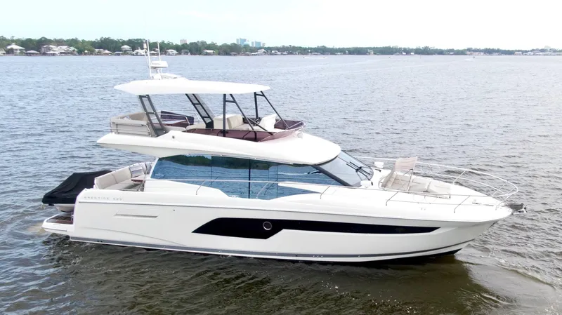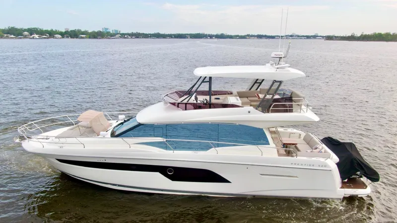 This 2019 Prestige 520 Flybridge HardTop features a 3-stateroom / 2-head layout (plus crew quarters & head). She is easily handled from the upper and lower helm or cockpit docking station and offers multiple zones for relaxing in comfort. The extra-large flybridge provides adjustable lounges on the foredeck, comfortable cockpit seating, a bright and inviting saloon, plus an on-deck galley. In the saloon, extra-large windows contribute to the soft, warm atmosphere of the interior while offering unimpeded 360-degree visibility from the Helm.