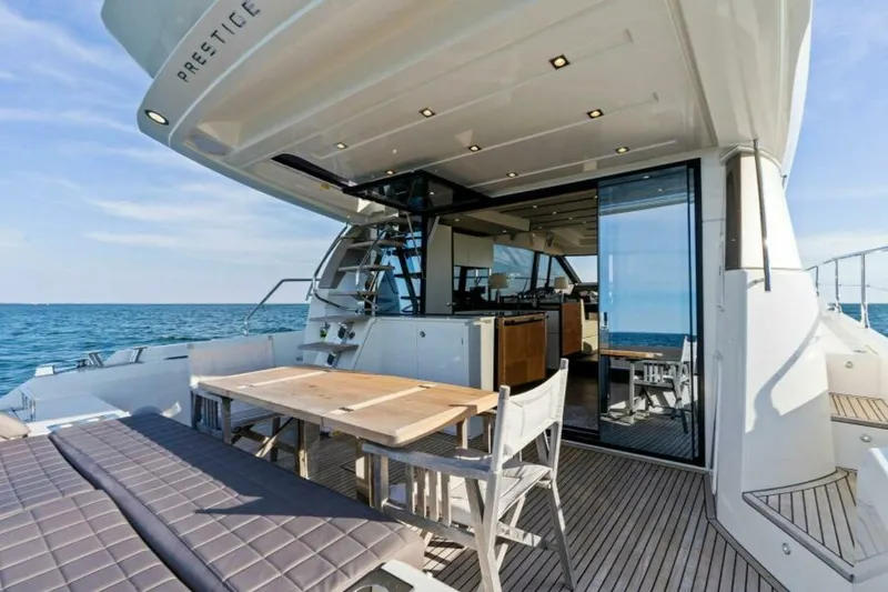 2019 63 Prestige Flybridge - "RT Time" is the only Prestige 630S currently listed for sale in the US. This model offers the best of both worlds with a spacious flybridge and a hydraulic removable bimini top and she transforms into a sleek-looking sport yacht with a large sunroof over the interior helm station.