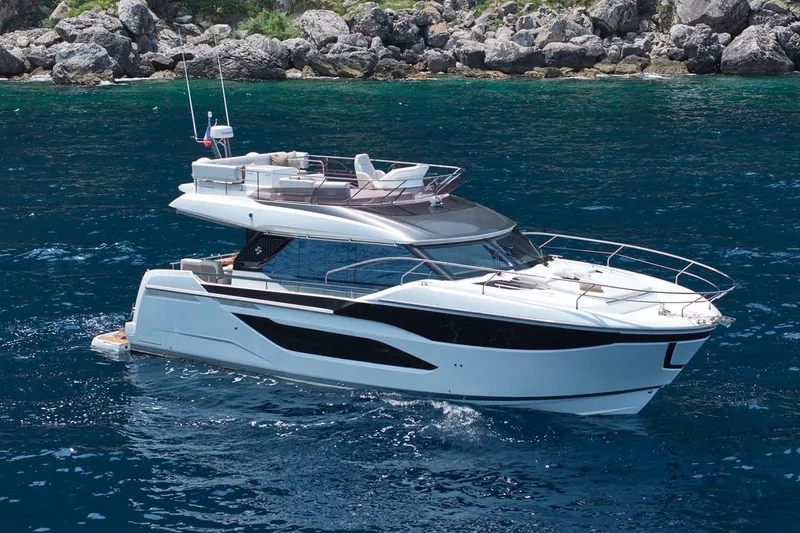 Inspired by the movement of water, the elegant, fluid exterior lines of the hull of the F4.9 marry perfectly with the polished surfaces of living spaces, reflecting an abundance of natural light. Curves have been meticulously studied to confer softness, refinement, and power to the whole. The exterior and interior furnishings have been reinvented to offer exceptional comfort for all on board. Particular attention has been paid to the selection of new materials, such as natural stone, sculpted woodwork, and wicker. Designed by Garroni Design, the F4.9 heralds the design of future models of the F-Line, featuring even greater comfort and an exceptional level of finish.