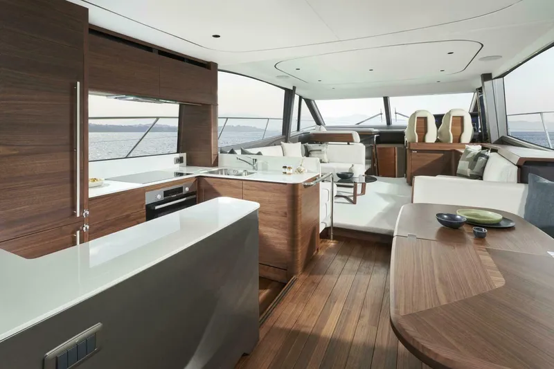 The expansive main deck is segmented into an aft galley with dinette, saloon with large U-shaped sofa plus companion seating opposite the helmsman area which features a side access door to the deck.