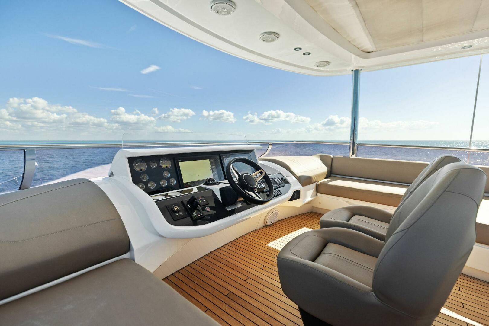 But the allure of this Y75 Princess goes beyond the master suite. Luxury amenities such as the Spot Zero/watermaker in the engine room to provide a steady supply of pure and clean water for added comfort and safety, upgraded large TVs for enhanced entertainment and superior helm chairs elevating your cruising experience to unprecedented levels, showcase the meticulous attention to detail designed to enhance your pleasure on board. Step outside to find a forward sunshade with carbon fiber poles for shaded relaxation, and a full cockpit cover to maintain the appearance of the yacht for years to come.