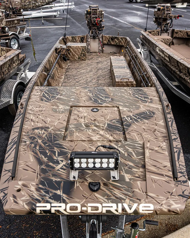 The "TD Edition", like all Pro-Drive Boat Models now come with a fully flush floor design. Wall to wall. Custom Built with Marine Grade 5086 Aluminum sheets, 1" x 2" extrusion welded ribs that run the full length of the boat, then solidly braced with 2" x 2" square tubing and 1" x 2" rectangular tubing every 10" to strengthen the bottom ribs, full floor, and side walls.