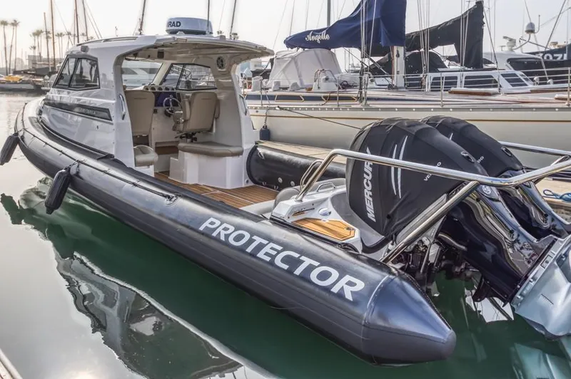 New model style 330 PROTECTOR TARGA from Any Water Yachts (Official Protector USA Dealer). The only available pre-owned 330 on the market with 210hrs on a pair of Mercury Verado 400hp outboards. This Protector includes a full electronics suite with dual16" Simrad displays, Radar, Depth, external gps antennae with rate compass for radar overlay, VHF with AIS and premium Fusion sound system. The boat also includes the optional Maxwell under bow auto anchoring system with Stainless Anchor upgrade, Bow Thruster, and SeaDek flooring. Price includes all of the above plus its dual axle trailer.