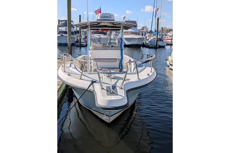 The Pursuit 2870 Center Console features in-floor fish boxes and abundant storage making it very fishable. With its wide beam and dependable Mercury outboards, this boat features a smooth ride. Designed for some serious fishing, the 2870 Center Console comes complete with rocket launchers, a freshwater sink and live well in the leaning post, a macerated fish box with pump-out, and lockable storage for tackle and gear. The advanced hull design delivers economic performance and outstanding fishability. Creature comforts on this boat include the flowing design of the command center, tons of additional seating, courtesy lights, a fully enclosed head with a pressure water sink, and well-placed drink holders. New lower units for each Mercury engine providing years of trouble free use. New engine oil pan and hydraulic engine trim. New Garmin electronics and always yard maintained. Encloses solar panel for battery charging. Call today and start making memories