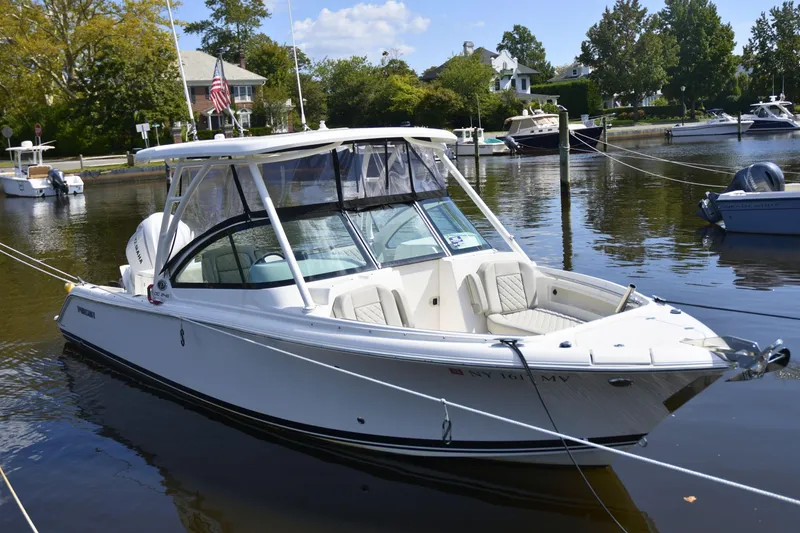 Loaded with premium options including a fiberglass hardtop with full enclosure, Garmin electronics, and Yamaha joystick maneuverability, this Pursuit is turn-key and ready for her next adventure.