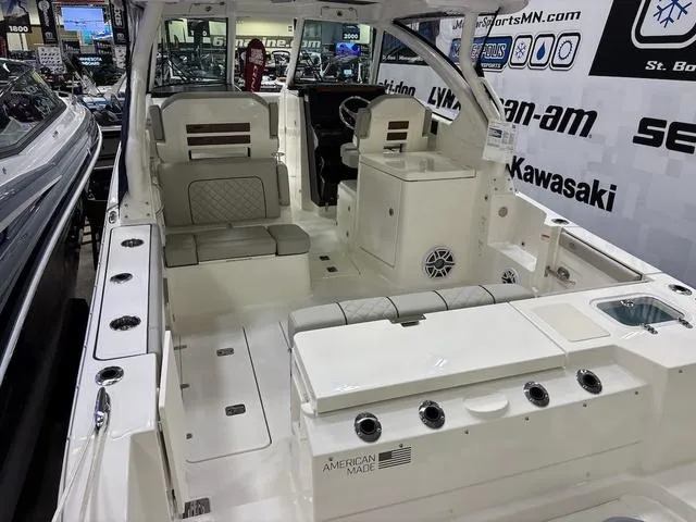 - Port-side Aft Facing Seat with folding armrest, Concealed Tackle Storage, recessed drink holders, and Insulated Cooler Below