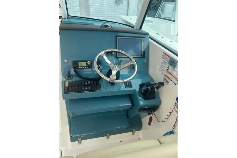 - Molded fiberglass aft tilting helm with instrumentation visor electronics mounting surface, fold out fiberglass foot rest/platform, and safety lanyard
