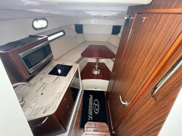 Pursuit�s award-winning product lineup now includes the OS 325. She delivers innovation and excellence in the perfect sized package. Pursuit�s OS 325 delivers a combination of finely engineered features designed with a timeless and elegant, yacht-caliber exterior. Her cabin finished with interior hardwoods, solid stock trim and modern fabrics comfort you for an intimate overnight in your private cove or harbor.