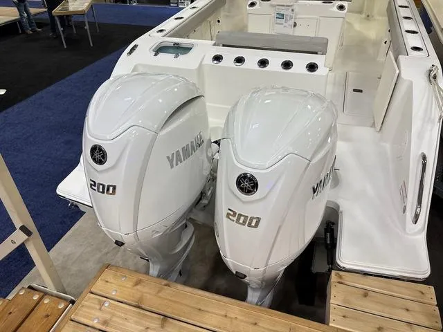 Twin Yamaha Digital F200 (Pearlescent White) with Digital Electronic Steering (DES) and Helm Master? EX Digital Electronic Control (DEC) (does not include joystick control) · Bow Seating Folding Backrests Port and Stbd · Bow/Cockpit Table, Fiberglass (w/Dedicated Storage) · Portlight in Console (SS Framed Window w/Screen) · Stereo - Premium Upgrade w/ Custom Tuned 6 Channel DSP Amp, 8"" Subwoofer, 4 6.5"" JL Audio Speakers and Blue Backlighting (requires Mid-Level Cockpit Accent Lights) (Backlighting Excluded From Hardtop Speakers Forward Of Windshield), w/SiriusXM, and External Antenna, includes 3 Month Subscription w/SiriusXM · Instrument Cover · Black (STD) Boot Stripe · Helm Colors Carbon (STD) · Prep · Anchor Windlass System w/ Remote · Bow Sun Pad (poly filler w/ cushion) w/Dedicated Storage · Mid-Level Cockpit Accent Lights, LED Blue (4) · Premium Helm Seating w/Four (4) Folding Armrests, Articulating Flipup Bolsters, Upgraded Seat Slide with Fore/Aft Adjustments, and Edson? 316L SS Steering Wheel with Control Knob and Non-Slip Grip · Bow Tonneau Cover · Leaning Post Cover · Black (STD) Canvas Colors · Freight