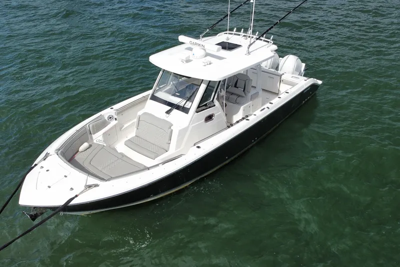 2023 Pursuit S328 Sport center console powered with Twin Yamaha F300 with approx 520 hours. Carbon Hull and Helm color with platinum boot stripe and black anti-fouling bottom paint. No trailer included.