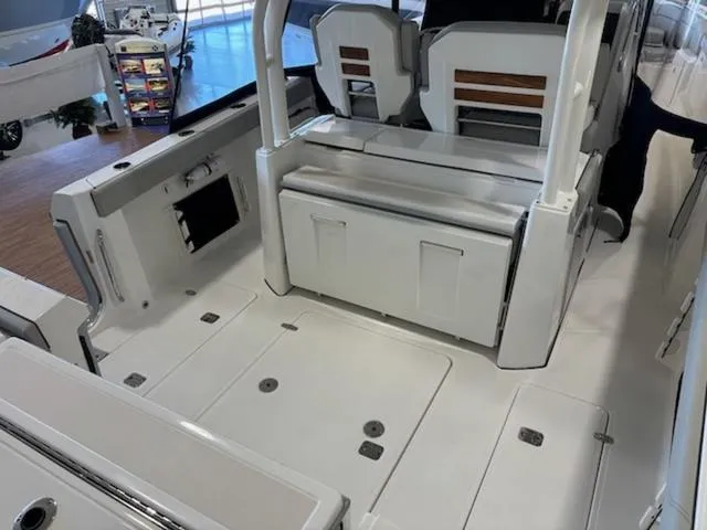 The athletic 32 features an oversized fiberglass integrated hardtop and windshield system, updated classic sheerline, through-stem anchor system and integrated transom extensions.