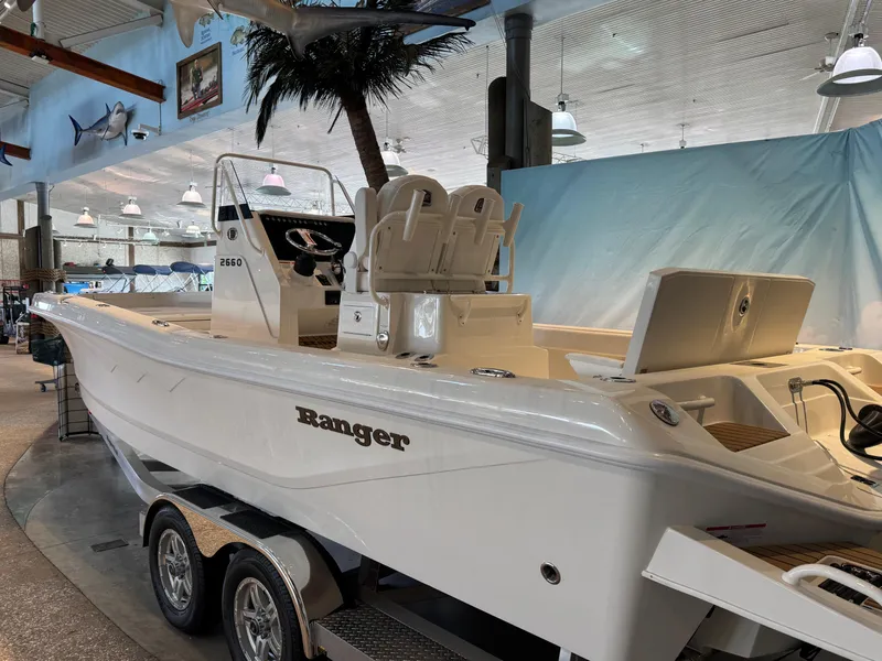 The 2660 Bay Ranger builds on Ranger's sterling lineup of bay boats with a new hull, expanded capability and an extreme attention to detail to deliver incredible performance and fishability to pursue saltwater species around the globe. Twin rod storages and a massive fish box highlight the angler-centric front deck that is ideal for casting jigs or nets. Live bait rides behind the helm seat and/or in the front deck step for quick access to keep the bite going while rod holders throughout keep your gear handy. A rear swim platform and optional front-deck cushions add versatility to the 2660 for a family-oriented outing, but when it's time to get after the fish the 400-horsepower rating offers excitement on demand. The Ranger 2660 boasts ample muscle for all of your blue water quests.