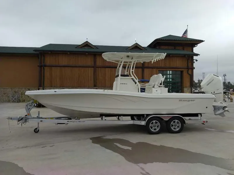The 2660 Bay Ranger builds on Ranger's sterling lineup of bay boats with a new hull, expanded capability and an extreme attention to detail to deliver incredible performance and fishability to pursue saltwater species around the globe. Twin rod storages and a massive fish box highlight the angler-centric front deck that is ideal for casting jigs or nets. Live bait rides behind the helm seat and/or in the front deck step for quick access to keep the bite going while rod holders throughout keep your gear handy. A rear swim platform and optional front-deck cushions add versatility to the 2660 for a family-oriented outing, but when it's time to get after the fish the 400-horsepower rating offers excitement on demand. The Ranger 2660 boasts ample muscle for all of your blue water quests.