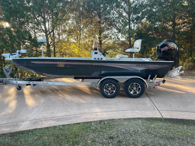 The RB200 packs more muscle in a bigger hull for greater performance, stability and capability to take you further than ever. The pad-bottom hull is designed for a dry ride that planes in a hurry, even in the shallows. The all-welded hull delivers strength in chop while precision steering and throttle control give you the ultimate in command. The wide, stable front casting deck delivers huge room for multiple anglers, and the interior is perfectly tailored for taking on inshore fisheries or a bass tournament with dual livewells and rod boxes, a huge in-deck storage and storage under the rear jump seats. At the helm, electronics up to 9" may be flush mounted and membrane-style switching delivers convenient simplicity. The ruggedized Ranger Trail® trailer is constructed with all-welded aluminum for the utmost in corrosion-resistant strength. Diamond plate fenders offer a step up and protection from road debris. A new camo version is more than just a paint scheme, this special rig features blacked-out badging, matte black closures and console railing, along with an all-black steering wheel for maximum concealment. No matter where your quarry swims, the enhanced capability of the RB200 is designed to Dominate Inshore and Nearshore.