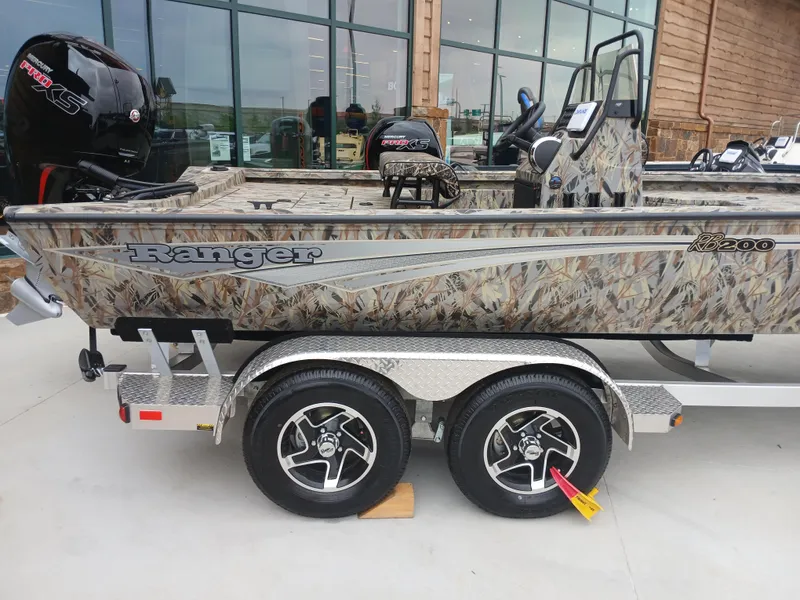 The RB200 packs more muscle in a bigger hull for greater performance, stability and capability to take you further-and deeper-than ever. The pad-bottom hull is designed for a dry ride that planes in a hurry, even in the shallows. The all-welded hull delivers strength in chop while precision steering and throttle control give you the ultimate in command. The wide, stable front casting deck delivers room for multiple anglers, and the interior is perfectly tailored for taking on inshore fisheries or a bass tournament with dual livewells and rod boxes, a huge lockable tackle stow, and extra storage under the rear jump seats. Inside the hull, the RB200 benefits from our patented pultruded fiberglass reinforcing in high-stress areas. This "superglass" is made by taking multiple types of fiberglasses, heating them and pulling them through a die to create a one-of-a-kind stronger-than-steel fiberglass that's found only in Ranger boats. At the helm, electronics up to 9" may be flush mounted and the Ranger RIDE™ touchscreen display keeps critical engine parameters and boat functions at your fingertips. The ruggedized Ranger Trail® trailer is constructed with all-welded aluminum for the utmost in corrosion-resistant strength and diamond plate fenders offer a step up and protection from road debris. New paint schemes set this rig apart even more with premium paints that deliver long-lasting shine and durability in salty environments. No matter where your quarry swims, the enhanced capability of the RB200 is designed to Dominate Inshore and Nearshore.